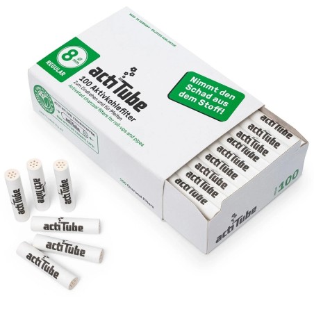 1 Caja de 100 filtros actiTube de carbón activado Regular . Los filtros regulares tienen un diámetro de 8mm, y son las más gruesa de todas las actiTube. se envia 1 cajita, en total 100 filtros de carbon activo.